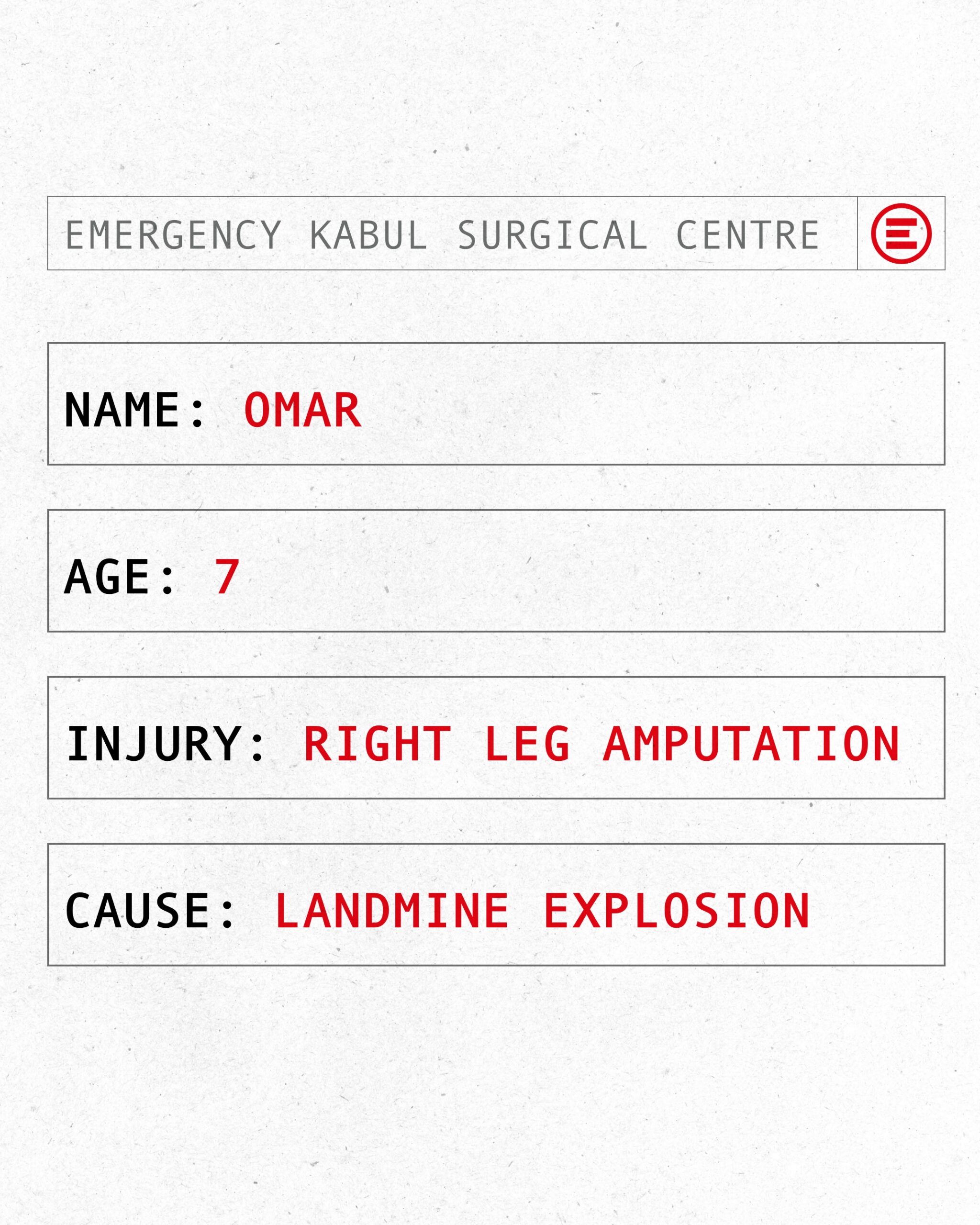 Omar and two of his family members were rushed to the Kabul Surgical Centre after a landmine exploded, just one of tens of thousands of unexploded ordnance littering the country. One of Omar’s brothers was killed by the explosion.