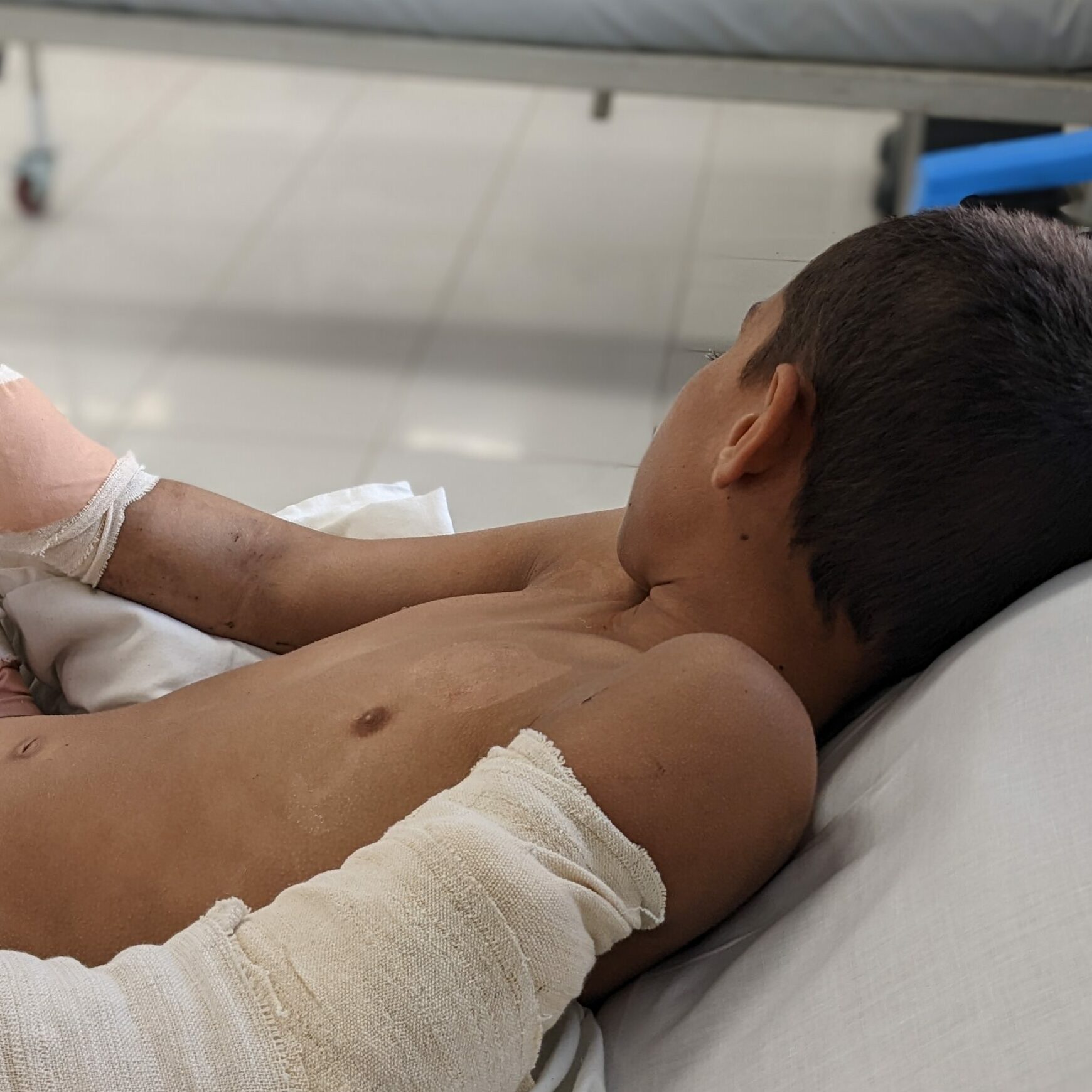 Mohammad’s right arm has been amputated below the elbow, and so have the fingers on his left hand. He has further injuries to his face, eyes and legs. But, our colleagues tell us, “The very next day, Mohammad was smiling with the nurses in the ICU.”